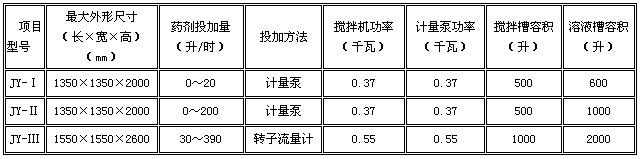 JY加藥裝置三種型號(hào),都有三大部分組成:攪拌機(jī)、溶液槽、計(jì)量投加裝置設(shè)備。